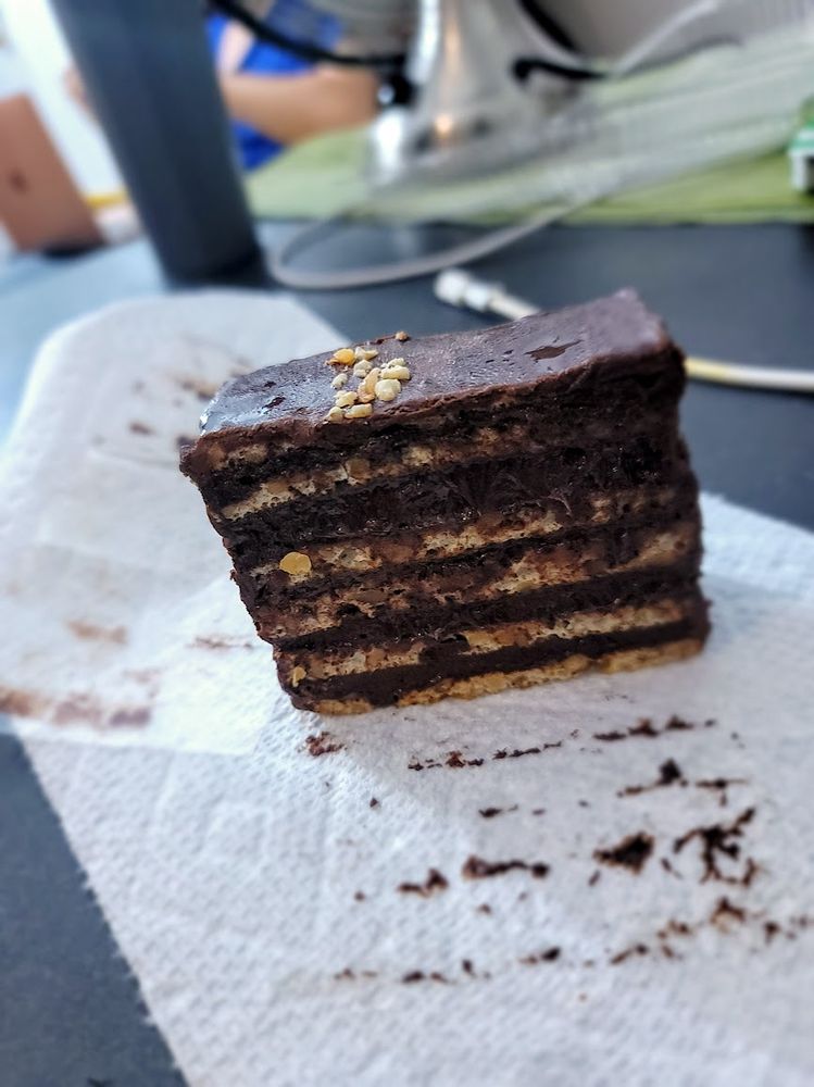 Chocolate cake with rum syrup and chocolate buttercream.